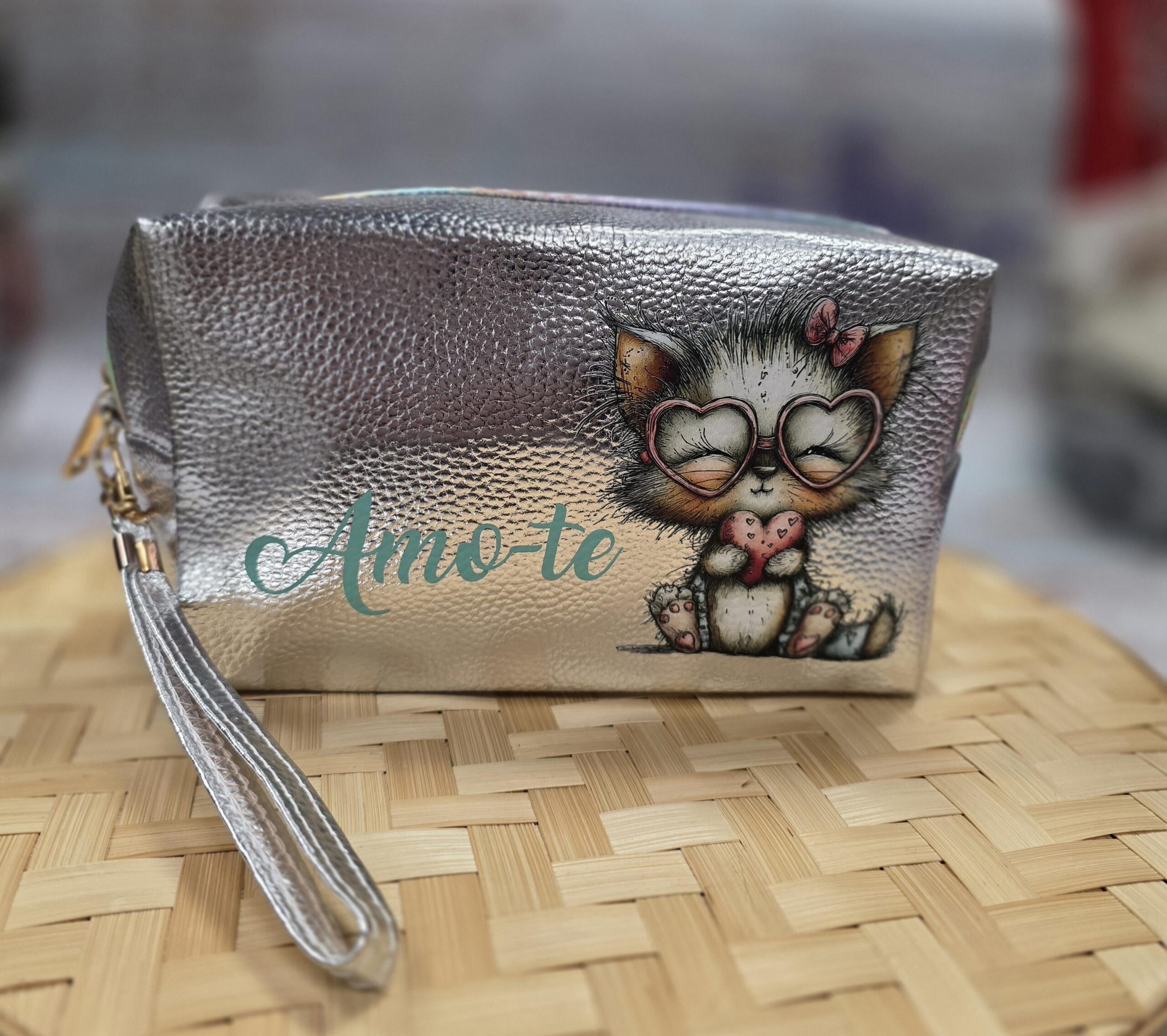 Necessaire retangular 12X19x8cm bastante charmosa e romântica, perfeita para quem gosta de acessórios com um toque fofo e brilhante, ideal para oferecer como presente.
